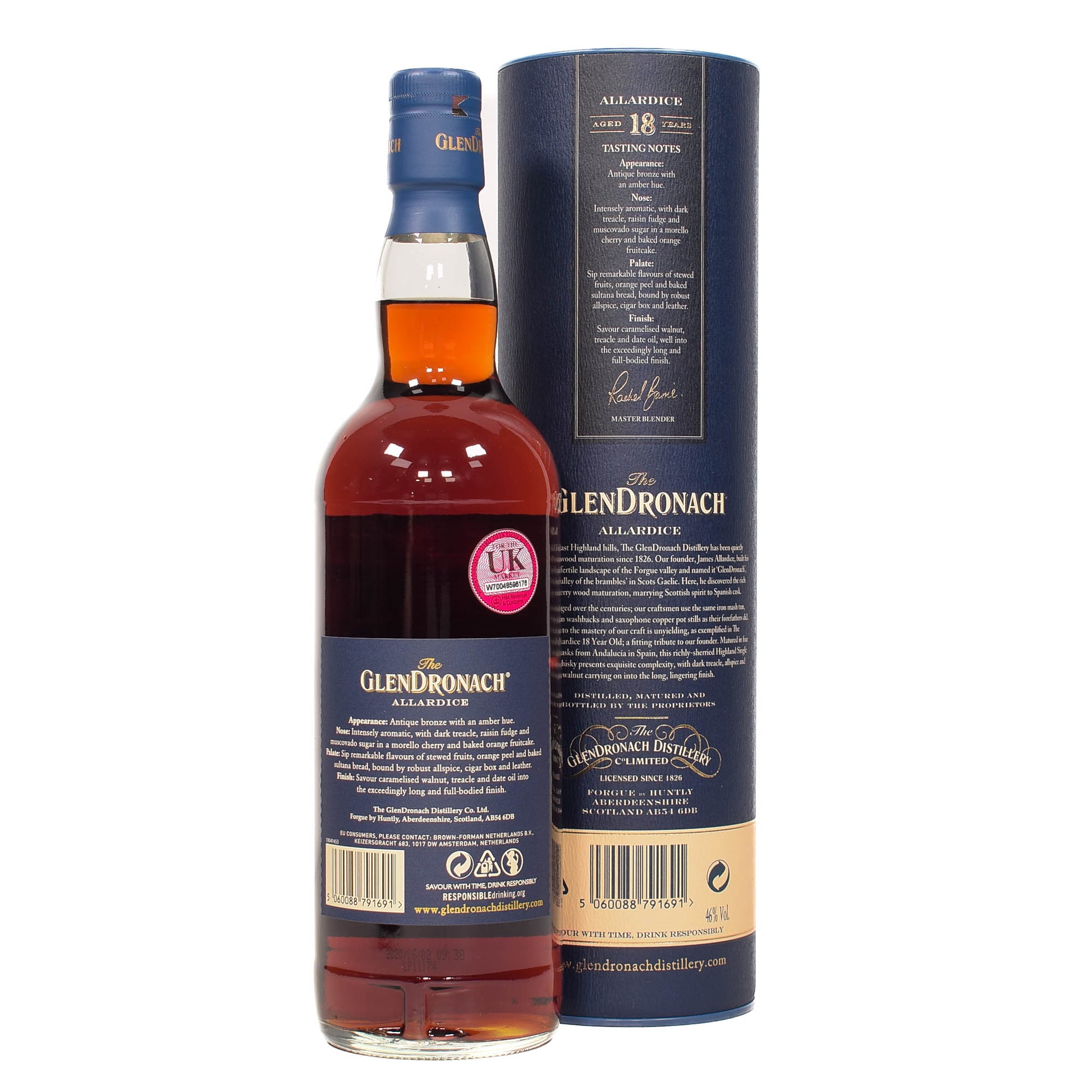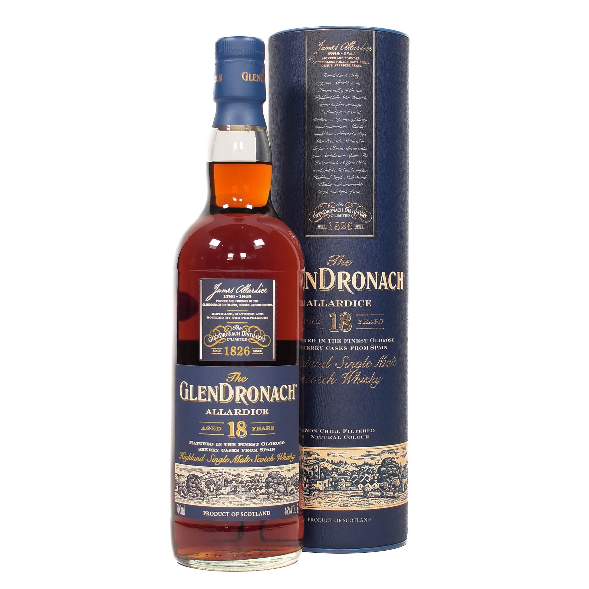 The GlenDronach 18 Year Old commemorates the 1826 founder of the distillery, James Allardice. Matured in Spanish oloroso sherry casks.