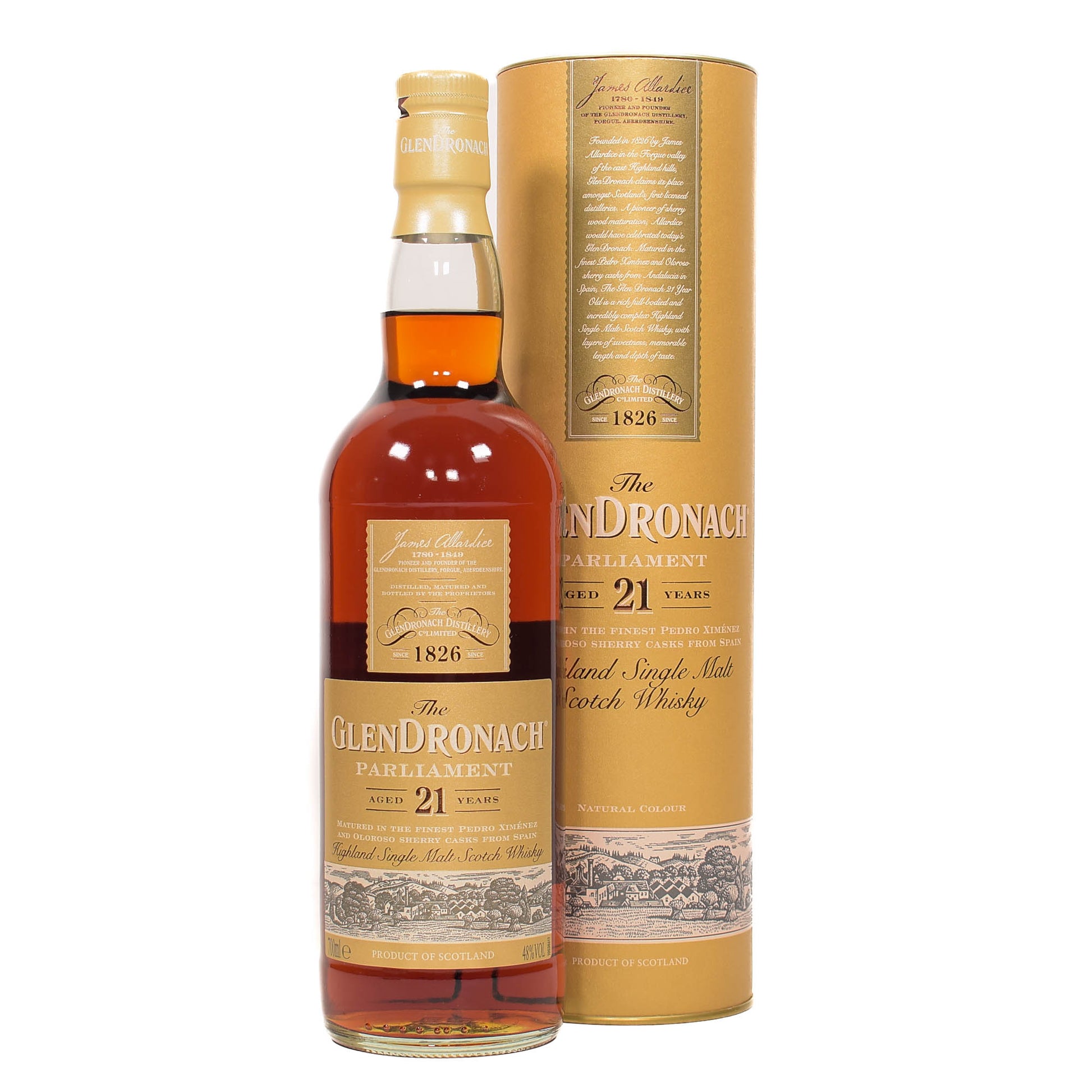 The GlenDronach Parliament 21 Year Old honours the parliament of rooks which continue to guard their warehouses. Matured in fine Pedro Ximénez and Oloroso sherry casks from Andalucía in Spain, this full bodied, richly sherried Highland Single Malt Scotch Whisky presents elegant and balanced layers of chocolate and spice carrying on into the long, lingering finish.