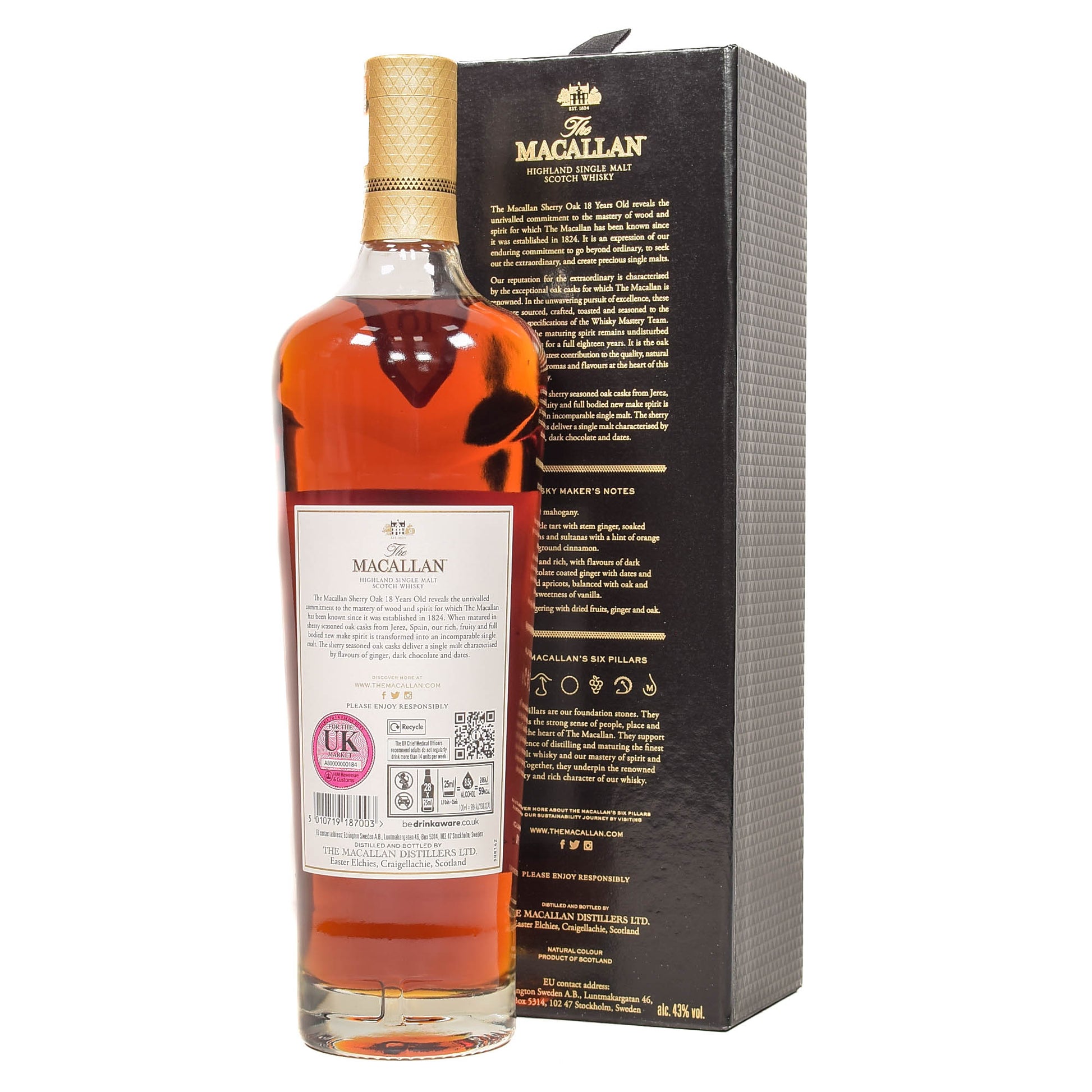 The Macallan Sherry Oak 18 Years Old forms part of the Sherry Oak Collection which features a series of single malt whiskies matured in hand-picked sherry seasoned oak casks from Jerez for richness and complexity. A full bodied palate of mature oak, ginger and raisin flavours is complimented by a light mahogany natural colour.