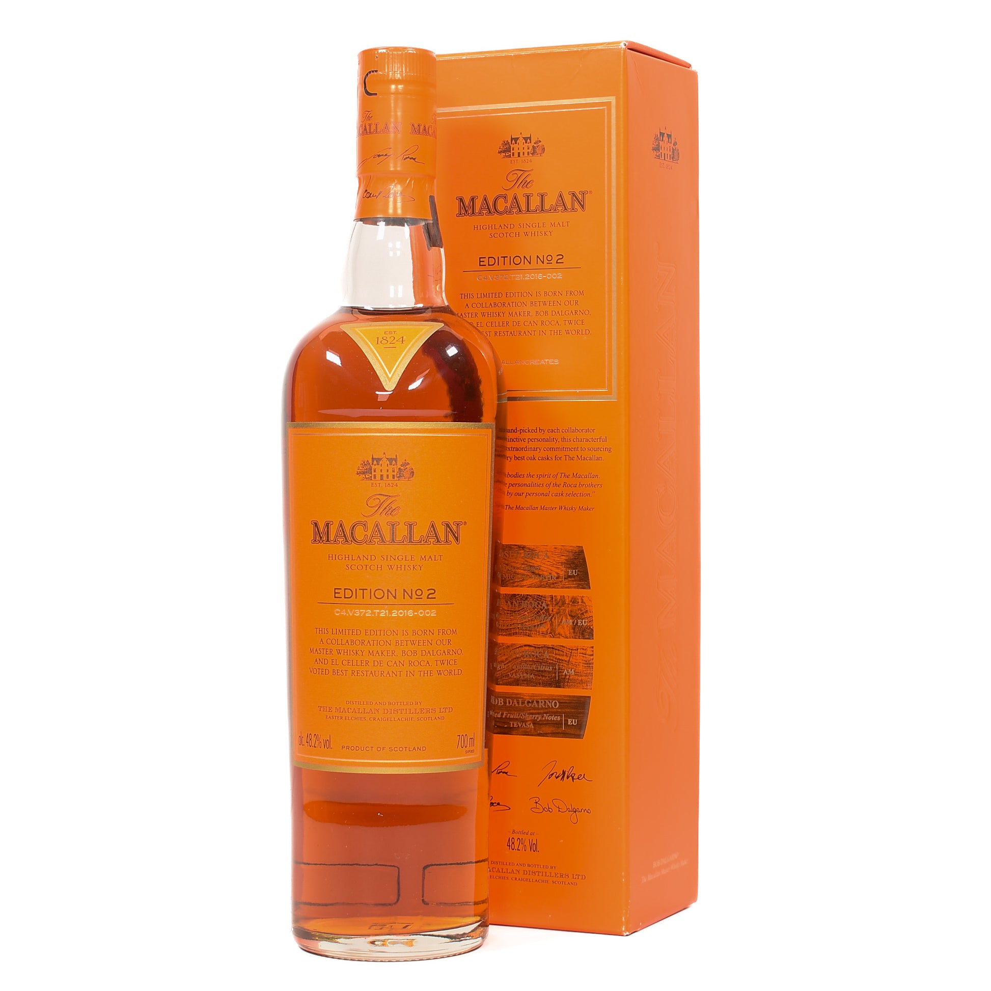 The Macallan Edition No. 2 is a sought-after single malt Scotch whisky from The Macallan's Edition series, which highlights the brand's dedication to wood management and flavor exploration. The Edition No. 2 was created in collaboration with the Roca brothers (owners of the acclaimed El Celler de Can Roca restaurant in Spain) and Bob Dalgarno, The Macallan's Master Whisky Maker. Released in 2016.