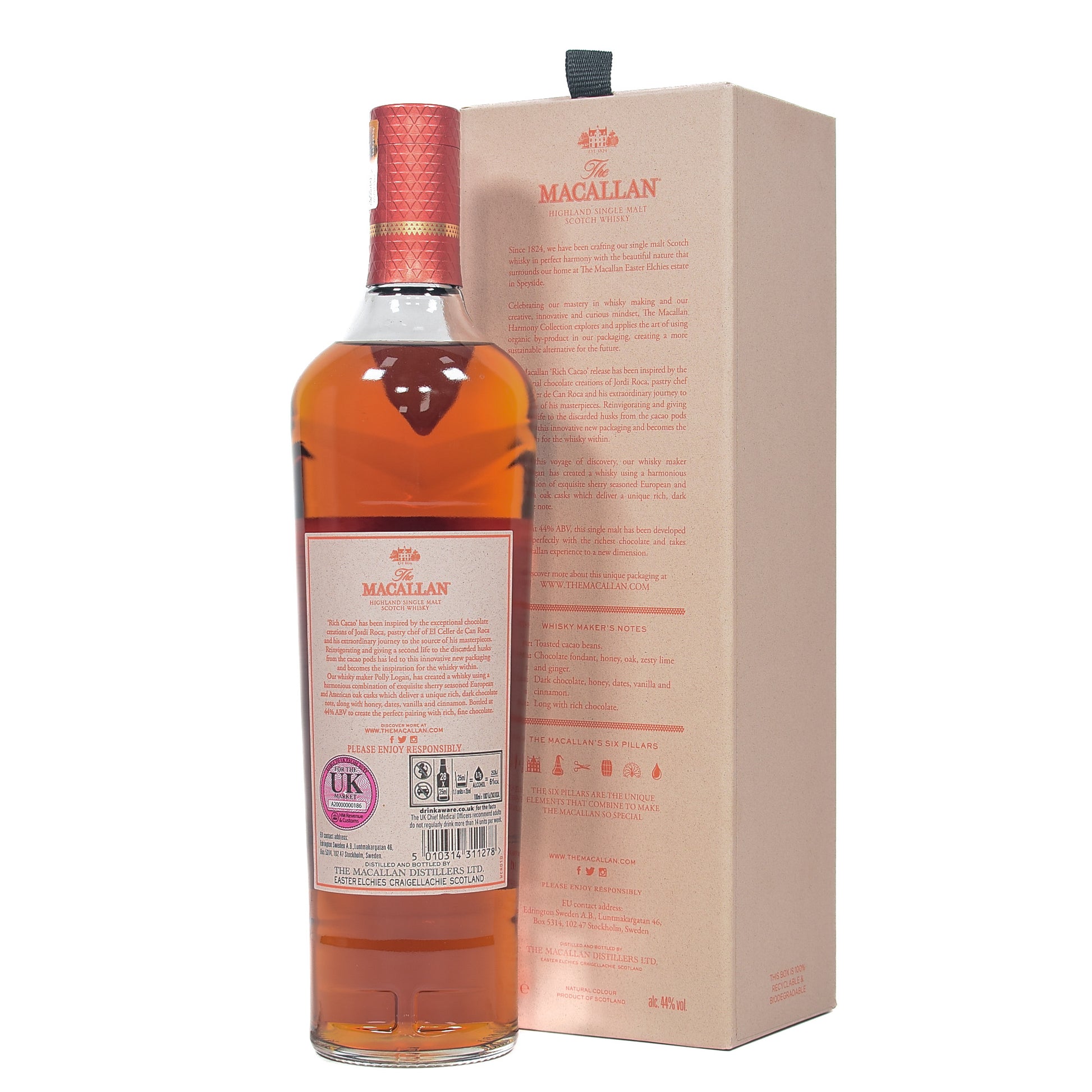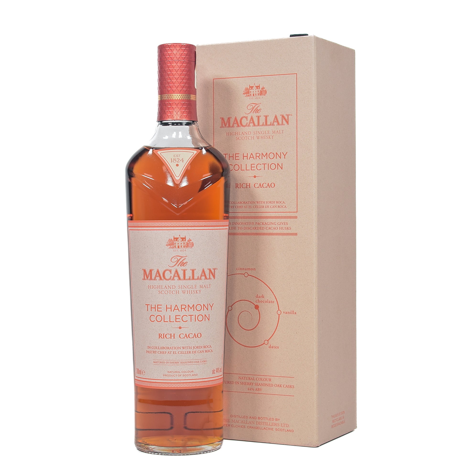 The Macallan Rich Cacao from The Harmony Collection is a luxurious single malt whisky crafted with sustainability in mind, inspired by the rich world of fine chocolate. Created in collaboration with renowned chocolatiers, this expression showcases a deep, chocolate-driven flavor profile, making it a unique and indulgent whisky experience. Its eco-friendly packaging is made using recycled cacao husks, emphasizing Macallan's commitment to sustainability.